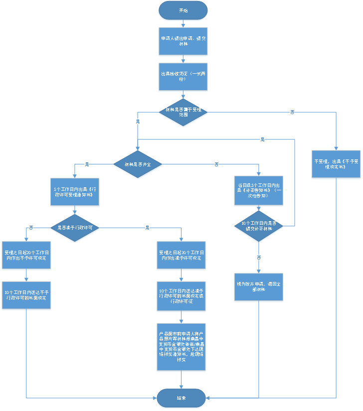 十四、办理流程 流程图见附录1 十五、办理方式 初次办理行政审批的办理方式为一般程序,包括申请、受理、初审、审查与决定、文书制作与送达、结果公开。 十六、办结时限 依据《中国人民银行行政许可实施办法》,江西省人民银行市级分支机构应当自受理申请之日起20个工作日内将初步审查意见和全部申请材料直接报送人民银行江西省分行。人民银行江西省分行应当在自受理申请之日起20个工作日内做出行政许可决定。20个工作日内不能作出决定的,经行长批准,可延长10个工作日。 十七、收费标准 不收费。 十八、审批结果 经审批,人民银行江西省分行准予在宣传品、出版物或者其他商品上使用人民币图样的,出具《中国人民银行江西省分行准予行政许可决定书》。不符合在宣传品、出版物或者其他商品上使用人民币图样法定条件的,出具《中国人民银行江西省分行不予行政许可决定书》。 十九、结果送达 自作出决定之日起10个工作日内向申请人送达《中国人民银行江西省分行准予行政许可决定书》或《中国人民银行江西省分行不予行政许可决定书》。 二十、行政相对人权利和义务 (一)依据《中国人民银行行政许可实施办法》,申请人享有以下权利: 1.委托代理人提出行政许可申请。但是,依法应当由申请人到行政机关办公场所提出行政许可申请的除外。 2.行政机关应当将法律、法规、规章规定的有关行政许可的事项、依据、条件、数量、程序、期限以及需要提交的全部材料的目录和申请书示范文本等在办公场所、互联网站公示。申请人要求行政机关对公示内容予以说明、解释的,行政机关应当说明、解释,提供准确、可靠的信息。 3.行政机关对行政许可申请进行审查时,发现行政许可事项直接关系他人重大利益的,应当告知该利害关系人。申请人、利害关系人有权进行陈述和申辩。行政机关应当听取申请人、利害关系人的意见。 4.行政机关依法作出不予行政许可的书面决定的,应当说明理由,并告知申请人享有依法申请行政复议或者提起行政诉讼的权利。 5.行政许可直接涉及申请人与他人之间重大利益关系的,行政机关在作出行政许可决定前,应当告知申请人、利害关系人享有要求听证的权利;申请人、利害关系人在被告知听证权利之日五个工作日内提出听证申请的,行政机关应当在20个工作日内组织听证。 (二)依据《中国人民银行行政许可实施办法》,申请人依法履行以下义务: 1.申请人申请行政许可,应当如实向行政机关提交有关材料和反映真实情况,并对其申请材料实质内容的真实性负责。 2.中国人民银行及其分支机构依法对被许可人从事行政许可事项的活动进行监督检查时,可以要求被许可人提供从事行政许可事项活动情况的有关材料,有权对被许可人从事行政许可事项的活动进行现场检查。 3.被许可人应当按照许可批准文件核准的范围使用人民币图样,并与申请事项保持一致。依法取得的人民币图样使用许可不得转让。不得涂改、倒卖、出租、出借、人民币图样使用许可批准文件。 二十一、咨询途径 省内中国人民银行地市级分支机构货币金银部门咨询电话见“十三、申请接收”部分的联系电话。 二十二、监督投诉渠道 中国人民银行及其分支机构上级行依法对下级行实施行政许可的情况进行监督,及时纠正下级行实施行政许可中的违法违规行为。 二十三、办公地址和时间 中国人民银行江西省分行办公地址:江西省南昌市铁街25号,办公时间:工作日,8:30-12:00,14:00-17:00。 省内中国人民银行地市级分支机构办公地址和办公时间请与各地市级分支机构联系,联系电话见“十三、申请接收”部分。 二十四、办理进程和结果公开查询 查询受理进程请联系省内中国人民银行地市级分支机构货币金银部门(联系电话见“十三、申请接收”部分),查询审批进程请联系中国人民银行江西省分行货币金银部门(联系电话:0791-886613100)。准予许可信息将在中国人民银行官方网站江西省分行子网站政务公开专栏“行政审批”栏目中公示。 附录:1.流程图 2.申请材料示范文本 3.常见错误示例 4.常见问题解答 附录1 人民币图样使用许可申请流程图