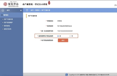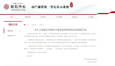 中国人民银行征信中心(以下简称征信中心)动产融资统一登记公示系统(以下简称统一登记系统)正式上线在线身份验证功能,支持机构常用户通过市场监督管理部门电子营业执照系统在线完成身份验证,实现业务办理全流程线上化。